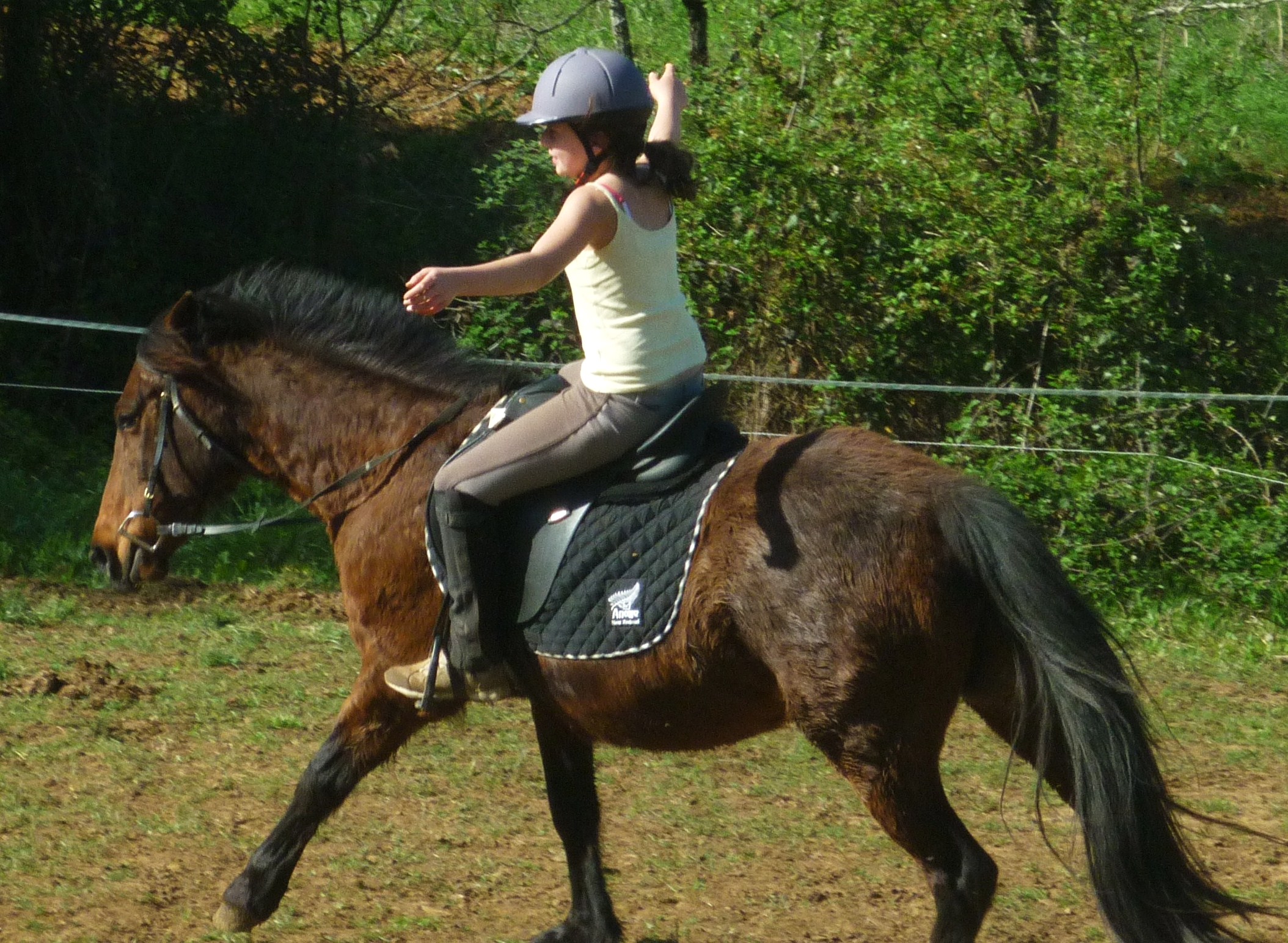 Soria , quand je l'ai eu , elle était extrêmement peureuse !!! Elle donnée très mal les pieds et ... ( accrochez vous bien ) ne savait pas galoper !!! Elle trottait très vite mais bon ! Aussi , elle avait une peur bleue des flaques ( je pense que tous les chevaux passent par là ! )